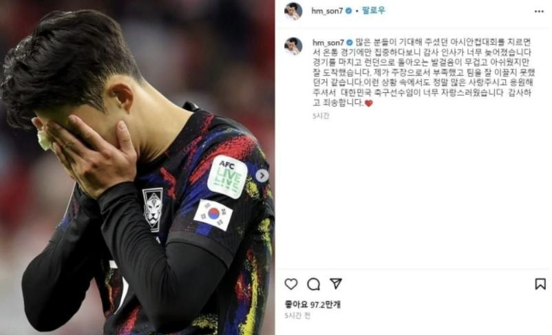 손흥민은 대한민국 축구 대표팀의 주장으로 카타르 아시안컵에 참가한 후 소속팀인 영국으로 돌아갔습니다. 경기에만 집중하여 감사 인사를 소홀히 한 것에 대해 인스타그램을 통해 소회를 전했습니다.